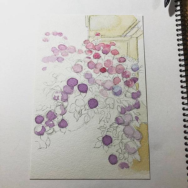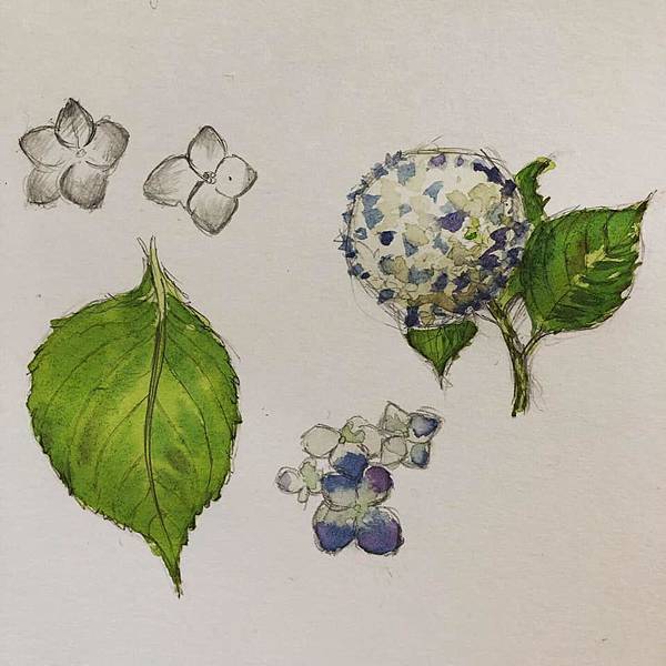 這裡真的好難啊! 繡球花是由很多小片的花瓣集結而成的,如果不表現出那個小花瓣,就會變成一整坨不知道是什麼的藍紫色大花