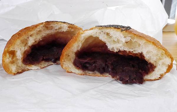 紅豆麵包跟一般的口感也不太一樣,麵皮有點兒像法式麵包,內餡是北海道產小紅豆
