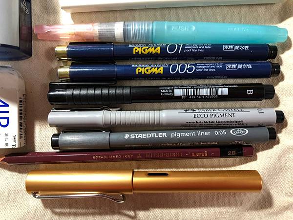 我平常畫小東西就用一支水筆解決,假日認真畫作品的時候就會派它們上場了