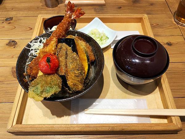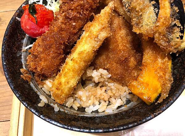 我點的丼裡面有兩塊醬汁豬排、一隻炸蝦、蔬菜類包含番茄、南瓜、茄子、小青椒、小玉米(依季節不同有所變化)